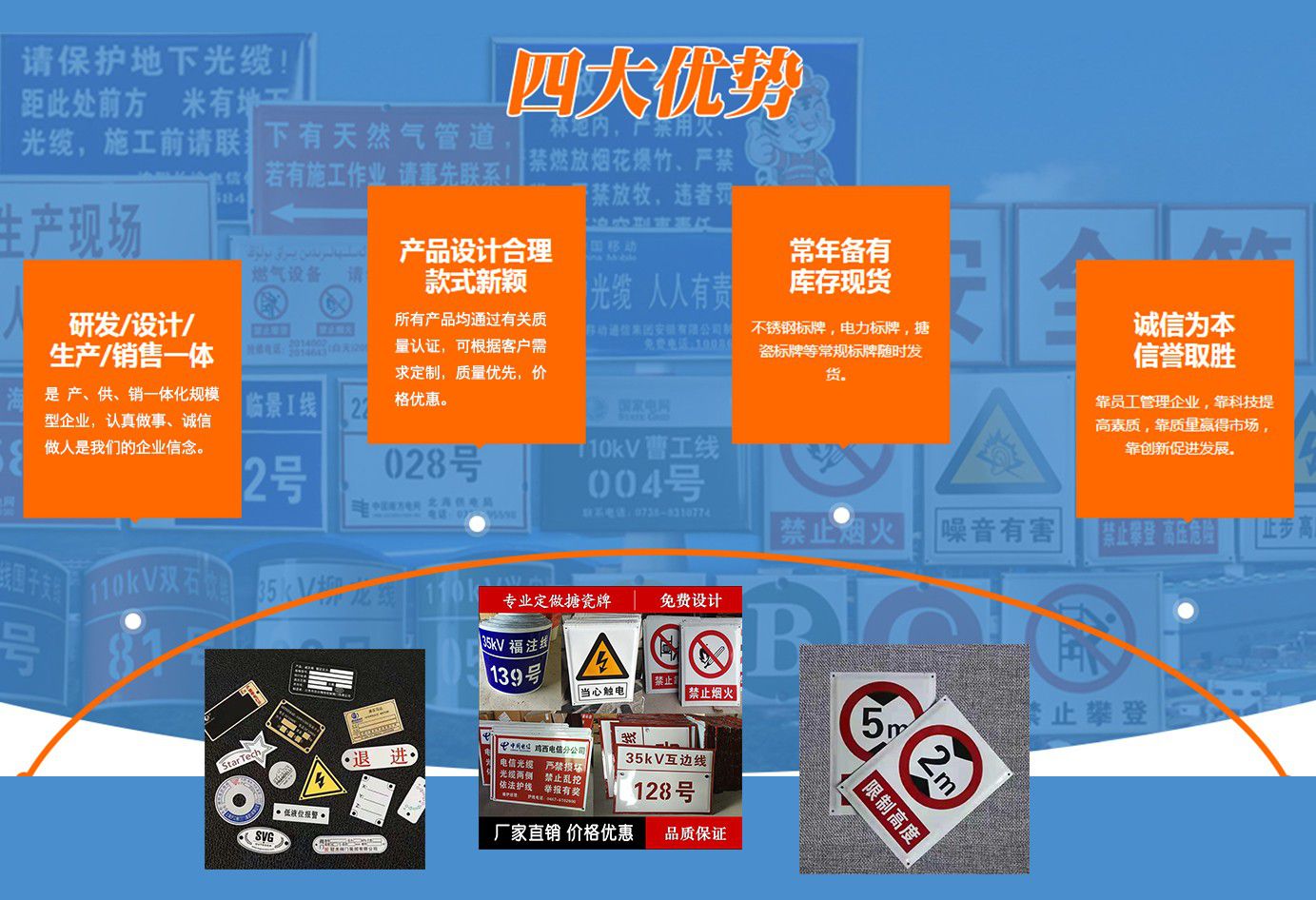 安徽峰銘標牌有限公司成立于2018年,2020年成立峰銘標牌山東分公司,是致力于標牌生產研發的專業企業。峰銘標牌多年來一直專注于標牌及印刷事業,擁有完善的生產技術和先進的生產設備,有多名金屬科研單位和標牌專業、標牌企業從業經歷人才,是專注于標牌標識及印刷品生產的專業型企業。  公司主要產品:腐蝕標牌,搪瓷標牌,絲印標牌,UV標牌,反光標牌,不銹鋼標牌,鋁合金標牌,PVC標牌,亞克力標牌,高光標牌,堆金標牌,烤漆標牌,電力標牌,電廠標牌,電網標牌,通信標牌,安全警示牌,相序牌,塔號牌,桿號牌,刀閘牌,閥門牌,銘牌,面板牌。交通標牌,交通標志牌,高速路標牌,道路標牌,路名牌,限速牌,限高牌,三維立體軟標,熱轉印標牌。地產標牌,鋼廠標牌,宣傳欄,精神堡壘,不銹鋼扎帶,廣告字,水晶字,沖孔字,彩頁畫冊、不干膠印刷等專業生產。  近年來,我公司堅持“科技興廠”的方針,引進先進的生產設備和技術,嚴格執行國家及行業標準,專注同行加工業務,與時俱進,打造出了一系列精美產品。我公司已通過ISO9001質量管理體系認證,我們將繼續貫徹“誠信經營、保質保量、交貨迅速”的方針為您提供更優質的服務。  目前我司和國內較多大中型電廠、電力公司、鋼鐵企業、通信企業、車輛企業、公路交通、機電設備、廣告公司同行加工等形成了...